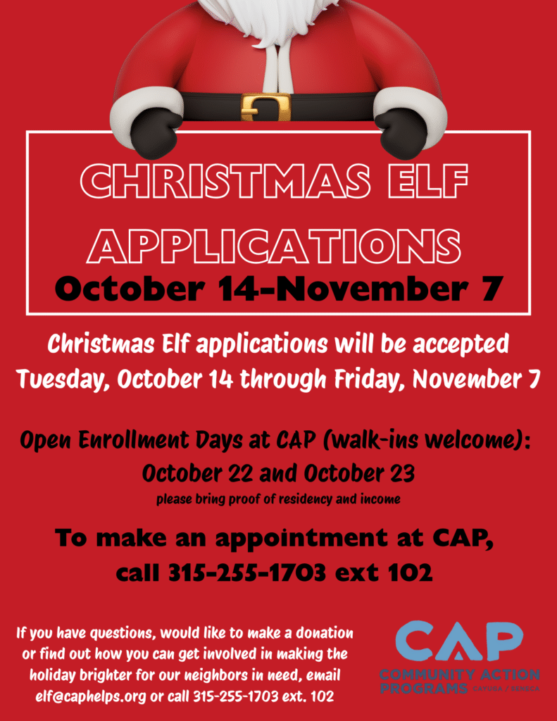 For families in need of assistance: Applications are now being accepted through November 7, 2025*.  Families can enroll through their child’s school, another human service agency or at CAP by appointment. To make an appointment, please call 315-255-1703 ext. 102 and leave a message with your name and contact information. We will call you back as soon as possible to schedule your appointment.